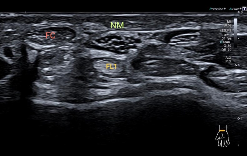 Observa el entramado del Nervio Mediano a su paso por la Muñeca con una semiología en panal de abeja típico de un nervio periférico normal. Lo acompañan flexor del primer dedo (F1) y flexor del carpo (FC) en el corte en eje corto.