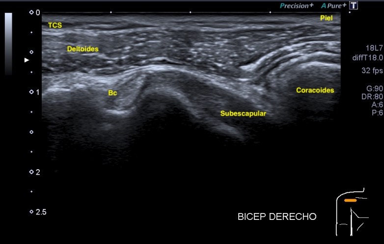 1. Tendón del Bíceps eje corto. La relación anatómica del Bíceps en la corredera bicipital con el Téndón del Subescapular y musculatura adyacente. Eje corto.