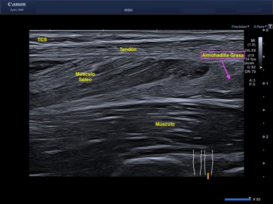 10. Almohadillas Grasas: Son áreas compuestas de células grasas, rodeadas de tabiques fibrosos tisulares. La almohadillas grasas están tremendamente irrigadas con capilares y presentan numerosas terminaciones nerviosas, su aspecto es hiperecogénico y heterogéneo.