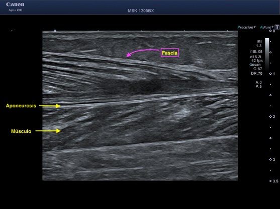 2. Aponeurosis: La aponeurosis es una membrana fibrosa formada principalmente por haces de colágeno que son hiperecogénicos y que tiene la función de servir de inserción a algunos músculos.
