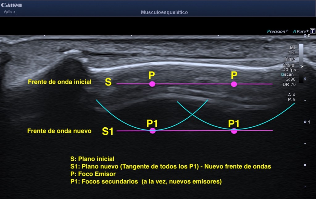 Esto es ni mas ni menos, la razón y explicación de porque las ondas se van trasladando a través del tejido que estudiamos con ecografía…todo tiene un Principio y este lo descubrió Cristian Huygens en 1678, las posteriores aportaciones de Fresnel hacen que se conozca como el principio de Fresnel-Huygens