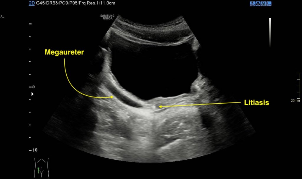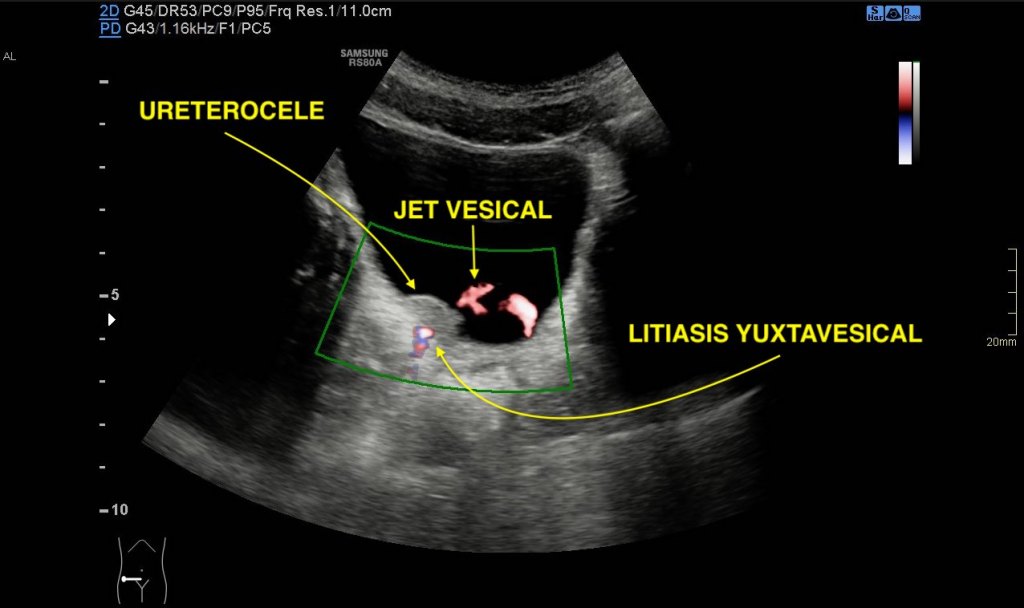 - En ecografía: Se busca evidencia de bloqueo en el uréter o cerca de la unión ureterovesical.