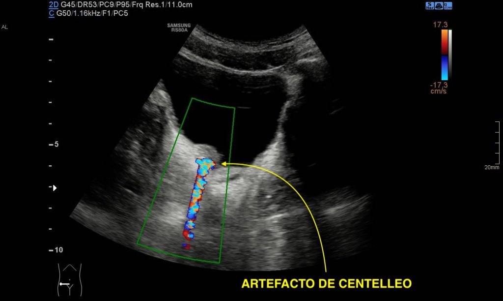 - Con Doppler se observa el artefacto o efecto de centelleo: