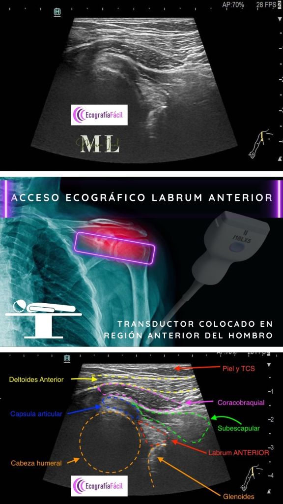 La exploración ecográfica del hombro es una herramienta diagnóstica fundamental en Ecografía MSK, permitiendo una valoración detallada de las estructuras musculoesqueléticas de dicha articulación. Tradicionalmente, el enfoque ha estado en el labrum posterior cuando finalizamos el estudio en el contexto del estudio del Tendón del Infraespinoso y del Redondo Menor; sin embargo, estamos ampliando nuestros horizontes para incluir el labrum anterior en nuestras exploraciones e incluirla dentro del protocolo. Este cambio promete mejorar significativamente nuestra capacidad para diagnosticar y tratar las patologías del hombro.