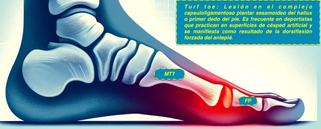 Introducción al Turf Toe: El «Turf Toe» es una lesión en el complejo capsulo-ligamentoso plantar (CPP) sesamoideo del hallux o primer dedo del pie. Es frecuente en deportistas que practican en superficies de césped artificial y se manifiesta como resultado de la dorsiflexión forzada del antepié.