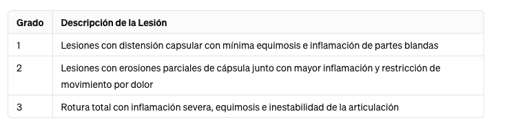 - Grado 2: Erosiones parciales de la cápsula con inflamación y restricción del movimiento.