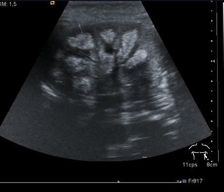 • Descripción: Marcada hiperecogenicidad de las pirámides con sombra acústica posterior evidente.