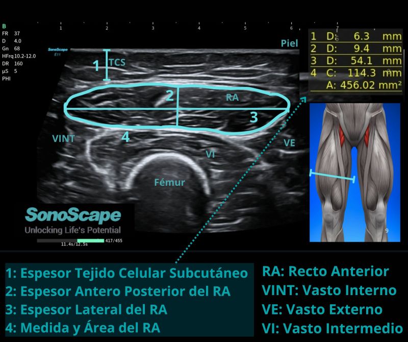 Uno de los principales músculos evaluados mediante ecografía nutricional es el recto anterior del muslo (RA) . Su medición se realiza en el tercio inferior del muslo , sin distinción entre lado derecho o izquierdo en condiciones normales.
