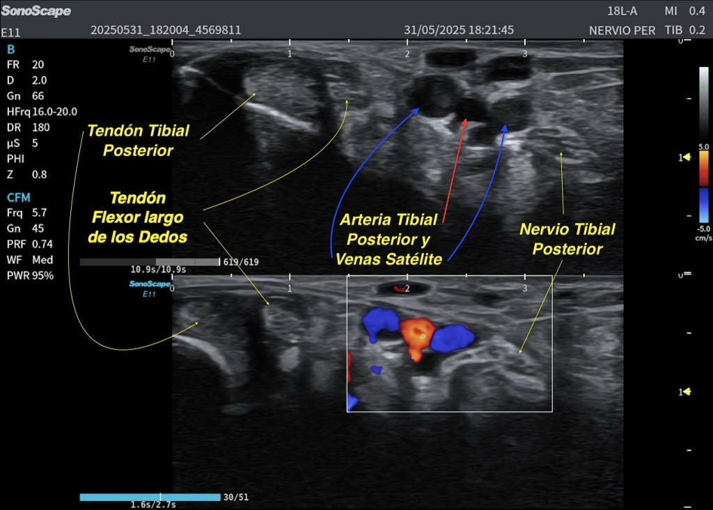Tendón Tibial Posterior: Ubicado medialmente, importante en la estabilidad del pie. Tendón Flexor Largo de los Dedos: Acompaña al tendón tibial posterior en su recorrido por la cara interna del tobillo. Arteria Tibial Posterior y Venas Satélite: Visualizadas con Doppler color, fundamentales en la valoración vascular. Nervio Tibial: De aspecto hiperecoico, adyacente a los vasos, objetivo principal en estudios neurológicos.