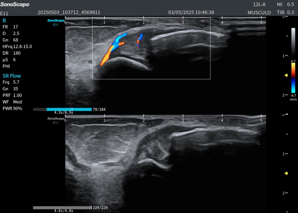 En el vídeo, mediante Doppler color, se evidencia aumento de la vascularización intraligamentaria. Este hallazgo no es característico de la fase aguda, sino más frecuente en lesiones subagudas o crónicas, donde existe neoangiogénesis asociada a la reparación tisular.