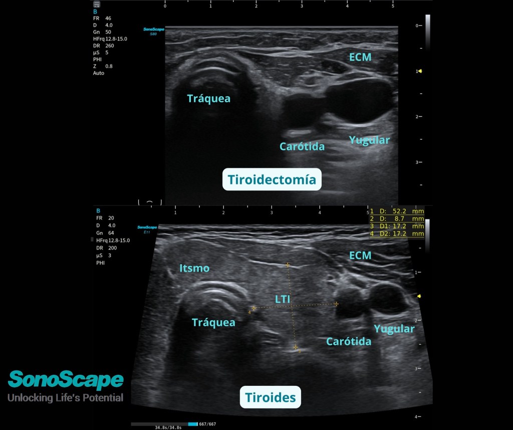 En la #Imagen Inferior, #Tiroides está presente (un poco globuloso), con su #Istmo y lóbulo izquierdo (#LTI) identificable.