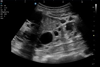 El patrón era bastante típico y, según el criterio del radiólogo, correspondía a múltiples quistes hepáticos, como queda reflejado en las imágenes ecográficas (imagen 1 e imagen 2).