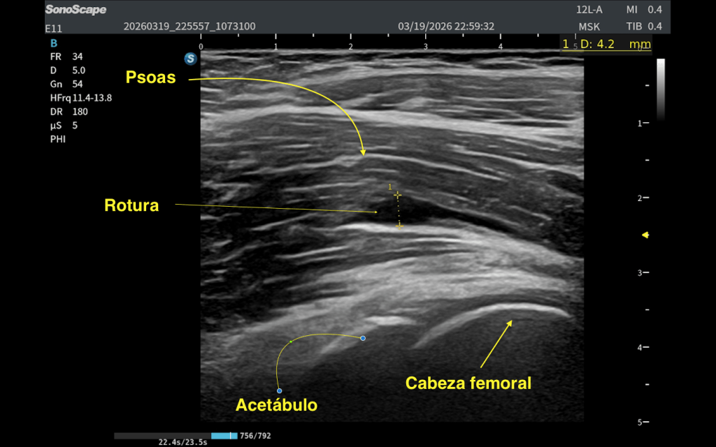 En eje longitudinal (eje largo – línea roja): Imagen anecoica alargada Localizada en las fibras profundas del psoas Con una longitud aproximada de 2,5 cm En eje transversal (eje corto – línea amarilla): La lesión se reproduce claramente, confirmando su existencia siempre en dos ejes. Si no lo veo en 2 cortes, no existe.