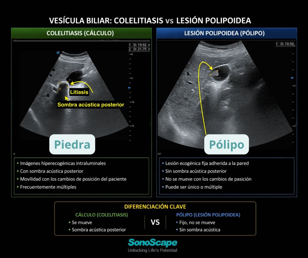En la práctica, la diferenciación no debería basarse en una única imagen. La ecografía es una técnica dinámica, y es precisamente en esa dinámica donde se obtiene el diagnóstico. Cambiar la posición del paciente, observar la respuesta de la imagen y valorar la presencia o ausencia de sombra acústica son pasos fundamentales.