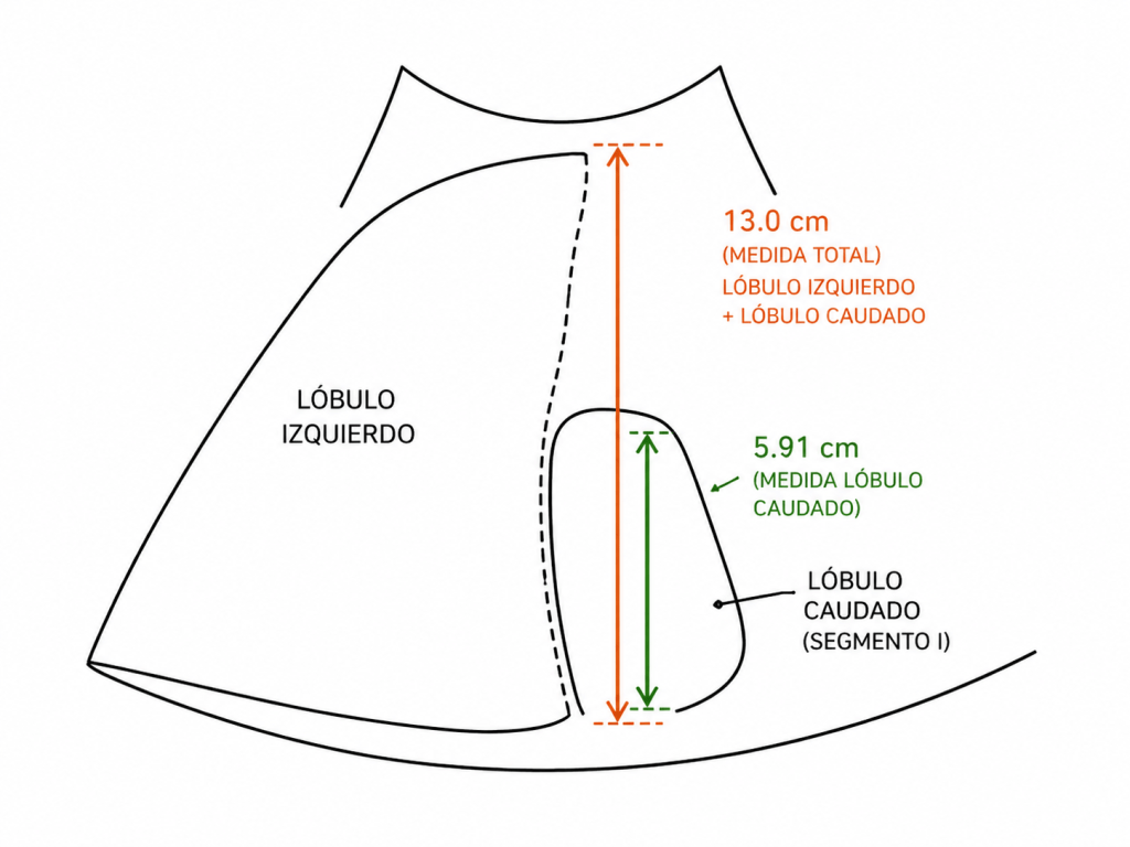 La técnica consiste en obtener un corte longitudinal parasagital que incluya el lóbulo izquierdo y el lóbulo caudado, y en ese plano medir dos diámetros anteroposteriores: por un lado el espesor del lóbulo caudado y, por otro, el espesor combinado del lóbulo izquierdo más el propio caudado. A partir de esta relación se establece una regla muy sencilla: si el diámetro del caudado supera un tercio del espesor total combinado, puede sugerir hipertrofia del lóbulo caudado.