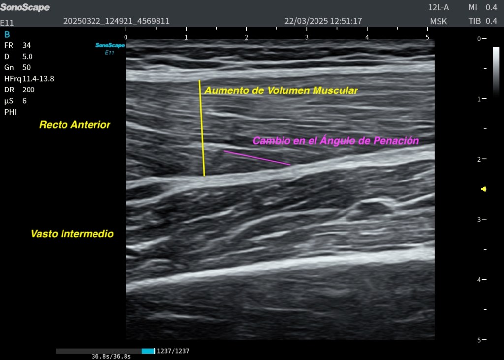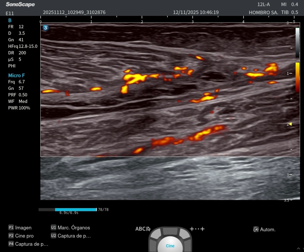 • Microvascularización intramuscular visible en modo Doppler en las fibras retraídas, indicativa de actividad reparativa.