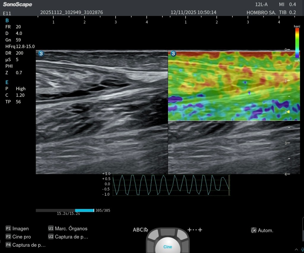• En la imagen de elastografía de strain, se evidencia menor rigidez en la zona del hematoma, como es esperable, y mayor rigidez en las fibras retraídas, que se comportan de forma más fibrosa y densa en la fase de cicatrización.