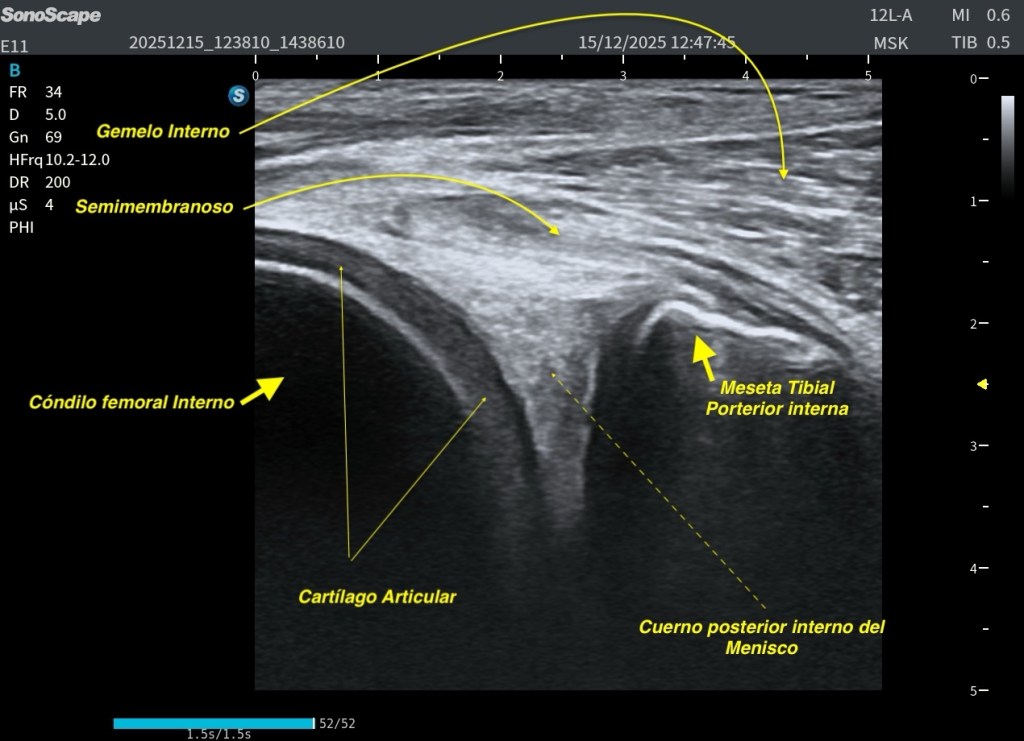El cuerno posterior del menisco medial es la zona de mayor relevancia clínica, tanto en patología degenerativa como traumática, y es el protagonista de la imagen ecográfica que acompaña este artículo.