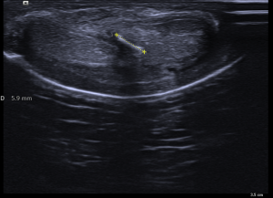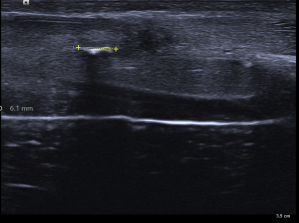 En estas tres imágenes ves claramente una calcificación grosera, ligeramente curva, que afecta a la túnica albugínea del cuerpo cavernoso izquierdo en su porción interna y profunda. Mide algo menos de 7 mm y esto ya se considera una placa bastante grande. El paciente, por cierto, no cumplía con los estándares de incidencia habitual, tenía menos de 40 años.