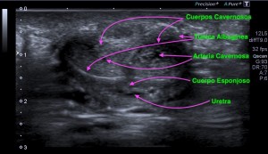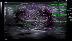 Lo primero que tenemos que conocer es la anatomía ecográfica del pene, el corte axial es normalmente el que mejor visión global del mismo no va a mostrar, ya que vamos a poder ver toda su anatomía y la relación de las diferente estructuras que la componen. Si el abordaje del pene es ventral o dorsal, nos dará una anatomía axial donde la uretra se situará superficial o profunda a los cuerpos cavernosos.