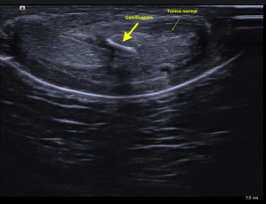 Tendinopatía Aquiles. Aumento de tamaño e hipececogenidadTendinopatía rotuliana. Aumento de grosor e hipecogenicidad.