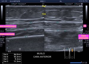 Me llama poderosamente la atención, lo recuerdo perfectamente, la normalidad del recto anterior, pero después de buscar un poco observo como el vasto intermedio si está «distinto», algo heterogéneo, voy a comparar con el lado contralateral y bingo¡ el vasto intermedio, que es de esa musculatura «que nunca tiene nada», modo «ironía on», te sorprende…y la ecografía muscular es como el océano, nunca puedes confiarte…