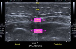 La exploración es la habitual, revisión sistemática de toda la ecoarquitectura musculoesquelética de la cara anterior del muslo, dirigido al Cuádriceps.