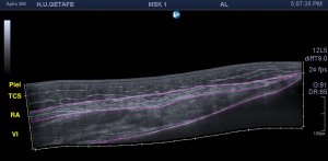 Lo único que me me llamó la atención fue la ecogenicidad (fig 1) de uno de los músculos del cuádriceps, en concreto el Recto Anterior, músculo anterior de la línea media de la musculatura en la cara anterior. Esta ecogenicidad era discretamente más ecogénica de lo habitual, sabemos que los músculos son hipoecogénicos por definición.