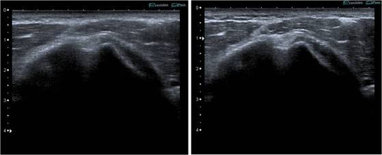 In the previous images, better visualization of the Biceps Tendon in the bicipital slider is shown if we place the focus at its height, more clear than if we place the focus in the depth of the image. Its appearance on the screen is usually a white triangle next to the centimeter line of the depth, there may be several bulbs at the same time that we use, so that we «focus» better in several areas of the screen, but this logically has a price, which is the refresh of the screen, that is, we are going to have less images per second on the screen and we can observe that the image goes as «jumps», as when we see a film in frames … that actually exhausts and for that reason the use of a single focus is recommended, in the area of interest.