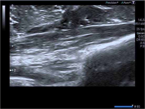 Ecográficamente el Nervio Cubital se verá en el corte transverso, redondo y ligeramente hipoecogénico debido al lugar donde se encuentra. En el corte longitudinal se verá como una «carretera» ligeramente curvado, hipoecogénico y con líneas centrales hiperecogénicas haciendo como «carriles», en este corte es muy complicado cogerlo íntegro,como la imagen que verás a continuación, tranquilx, solo es al principio.