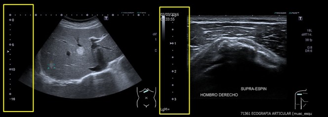 Imágenes de Hígado y Tendón del Supraespinoso y sus profundidades de estudio en rectángulo amarillo.