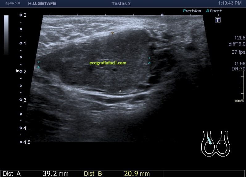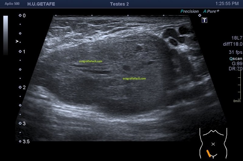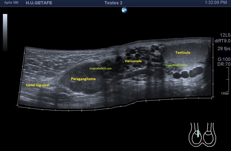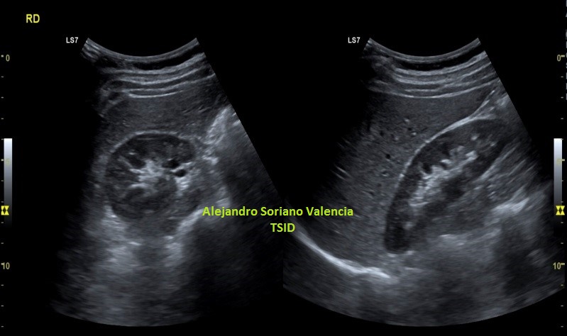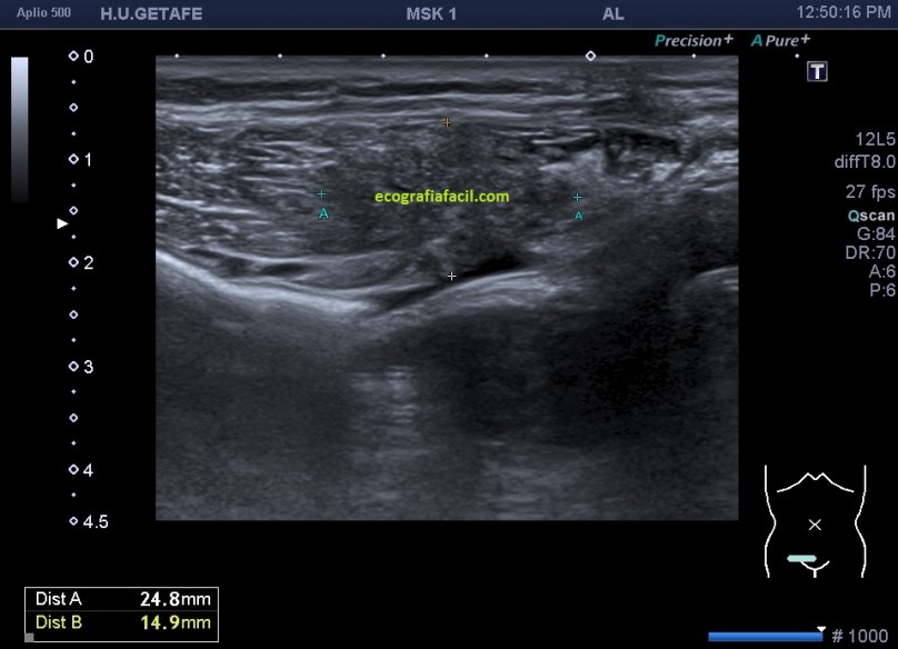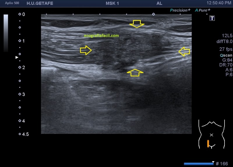 Semiológicamente es evidente una desestructura en el vientre muscular de recto anterior, que borra el aspecto normal del músculo y lo aumenta de tamaño aumentado su hipoecogenicidad. Los bordes son irregulares y de márgenes mal definidos.