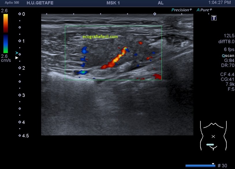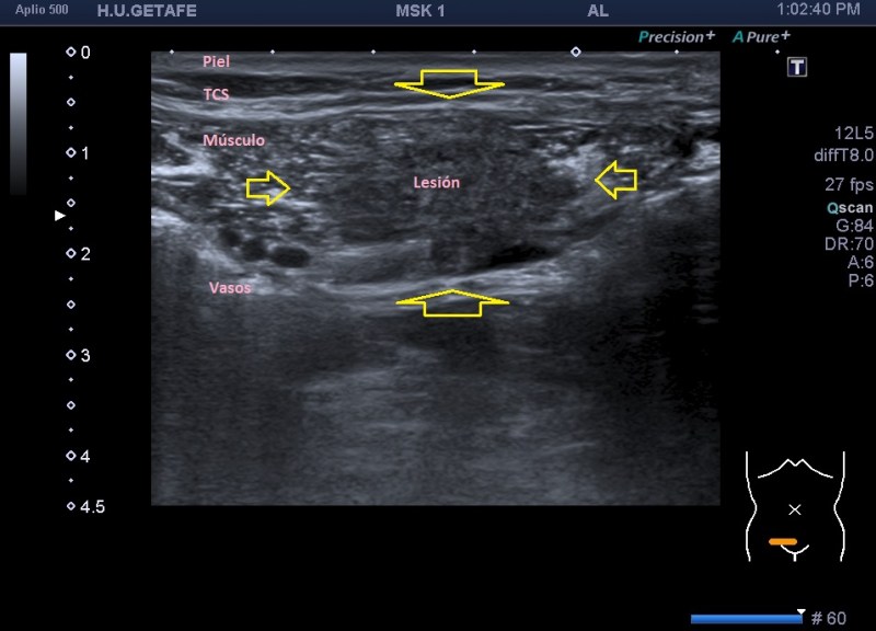 Una vez que tuve controlado el aspecto normal de músculo en la misma localización donde la paciente tenía el bulto, me dirigí a la región del bultoma y estudié la lesión, descrita con anterioridad, siguiendo el protocolo de actuación en caso de neoformaciones, control, medidas, doppler color y power y finalmente comparativa.