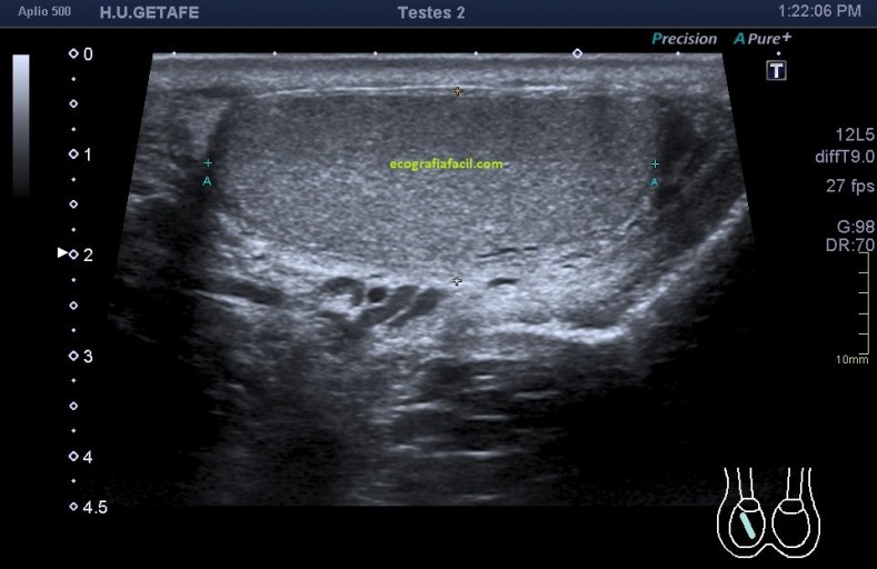 En este estudio, el estudio (perdón por la redundancia) contralateral no afectado es muy importante, diría yo, que una vez hecho el primer contacto con la lesión, lo primero es ir a comprobar la semiología del músculo y su ecoarquitectura normal. Encontramos en la zona contralateral sana un músculo de aspecto en “cielo estrellado”(punteado sobre fondo hiperecogénico) en el corte transverso y en forma de “penacho”(fibras alargadas hiperecogénicas sobre el fondo hipoecogénico de músculo) en longitudinal.