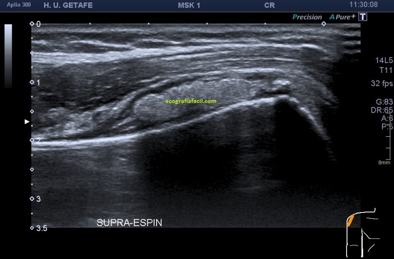 La exploración se lleva a cabo mediante una prestación de ecografía de partes blandas y se ejecuta con una sonda línea de alta frecuencia con preseteado de ecografía articular.