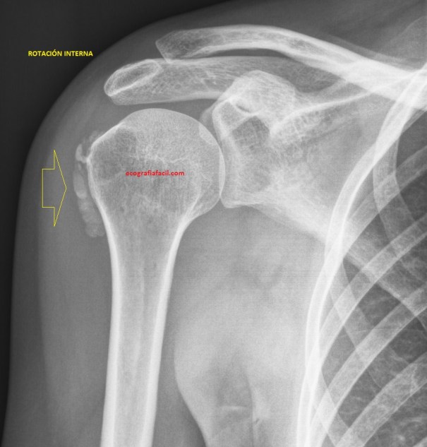 En la imagen 6 ves un conglomerado de calcios con la proyección interna, marcados por flecha amarilla fina, apenas visibles en la Rx en rotación externa, muy importante siempre ambas rotaciones cuando buscamos calcios.