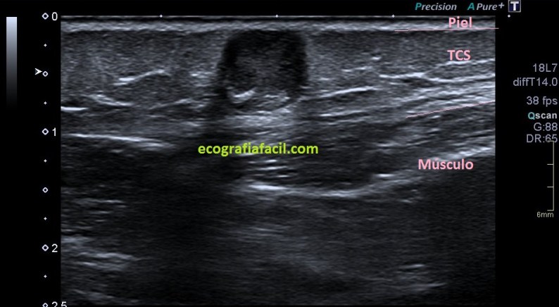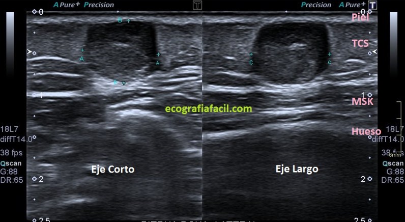 Normalmente encontraremos una lesión bien definida, hiperecogénica o isoecogénica con los márgenes definidos, en ocasiones lobulados, pero casi siempre ovalados con su eje largo paralelo a la piel en el plano subcutáneo y sin vascularización. Así, mira: