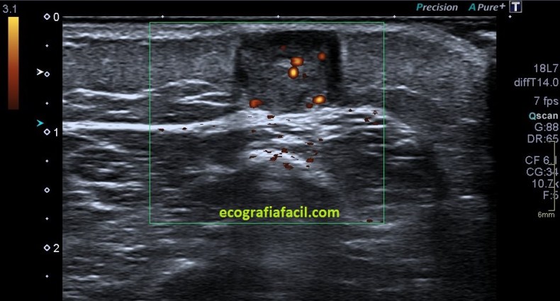Semiología: En zona de palpación, en el espesor de tejido celular subcutáneo, se aprecia una masa sólida, redondeada, de bordes bien definidos, con halo hipoecogénico periférico, heterogénea, de 1 centímetro en su eje largo, con algún punto ecogénico, y que con doppler color muestra algún vaso central que se objetiva también en el doppler power.