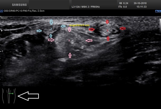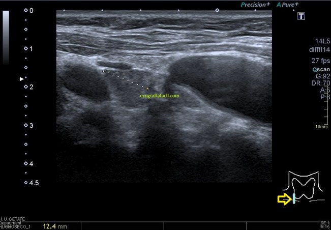 Criptorquidia: El testículo no descendido es una de las anomalías genitourinarias más comunes en niños. La mayoría de los testículos no descendidos son palpables y se localizan en el canal inguinal. Su aspecto ecogénico es normal, salvo si son vistos en la edad adulta, que pueden ser más pequeños y de ecogenicidad alterada. Objetivamente no van a estar en las bolsas y los vamos a encontrar donde marca el picto de la imagen 12. En ocasiones necesitan tratamiento quirúrgico. La flecha amarilla fina y alargada te marca la profundidad anómala debido a la piel y el tejido celular subcutáneo típico de la región inguinal, observa como cambia esta imagen respecto de cualquiera de las anteriores con los testes en sus bolsas.