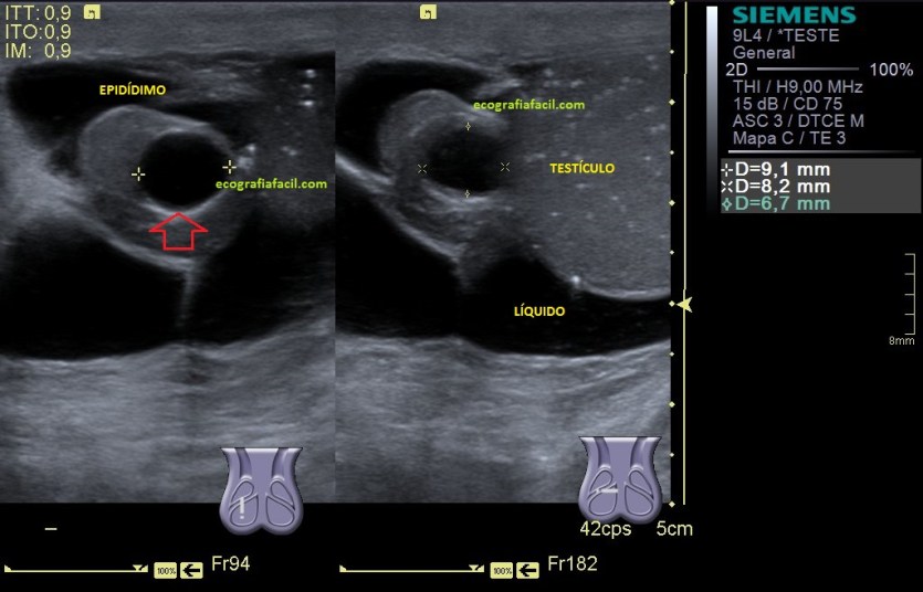 degeneración quística a causa de una hemorragía o una necrosis, pero habitualmente, los quistes (flecha roja), anecoicos, redondos, en número indeterminado y en la cabeza epididimaria son muy habituales y benignos (imagen 9), su tamaño también es variable.