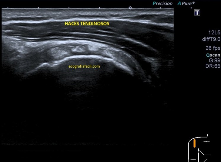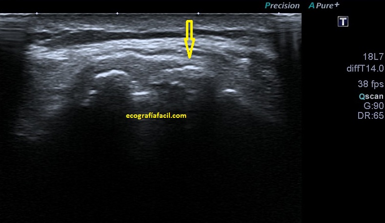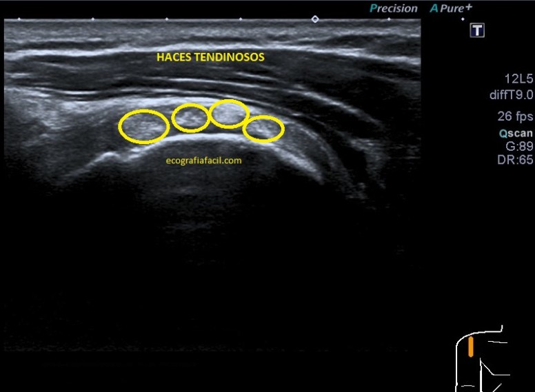 Efectivamente, verás que bordeando el tendón existe una mínima cantidad de líquido que está envolviendo u ocupando la vaina del tendón, se ve anecoico y efectivamente es cierto, si lo has visto, enhorabuena, a parte de la luxación, esa es la otra semiología evidente que podemos ver en la imagen 2.