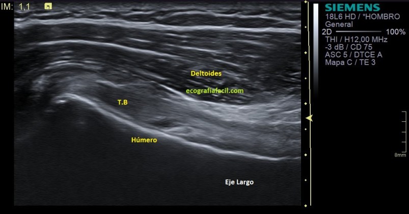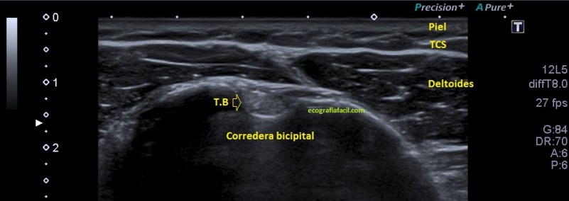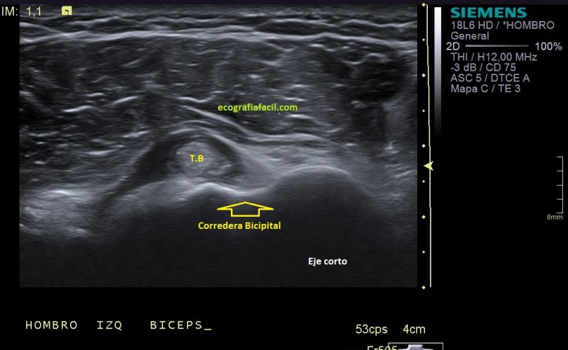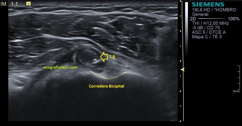Si tu lo quieres estudiar en un corte transverso o eje corto del tendón verás como muestra de normalidad la imagen número 1. Semiológicamente es muy agradecido. Ves el tendón ovalado, hiperecogénico reposado en la corredera bicipital. El ligamento transverso humeral, hiperecogénico y lineal, anterior a la estructura tendinosa que descansa en la corredera.