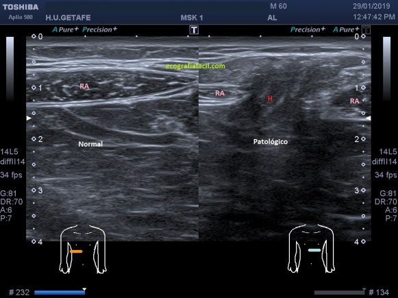 Efectivamente, verás que bordeando el tendón existe una mínima cantidad de líquido que está envolviendo u ocupando la vaina del tendón, se ve anecoico y efectivamente es cierto, si lo has visto, enhorabuena, a parte de la luxación, esa es la otra semiología evidente que podemos ver en la imagen 2.