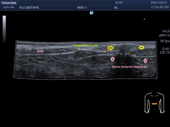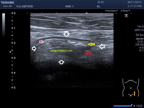 Te marco en la imagen 4 con una línea fina amarilla la corredera bicipital por si te había costado ver la relación con el tendón desplazado y que está indicado con la flecha amarilla, pero anisotrópico.