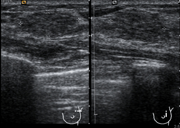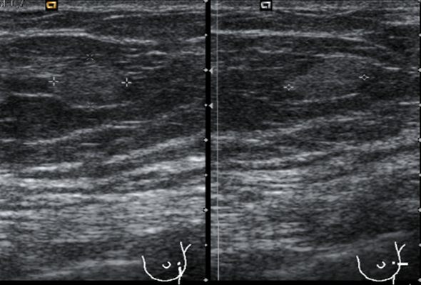 La ecografía muestra un tiroides multinodular, porque tiene otros tipos de imágenes nodulares al margen de la lesión estudiada. Adyacente al LTD y en contacto con la carótida común se observa una lesión nodular, sólida, no es anecoica ni tiene este componente, por tanto se considera sólida, hipoecogénica, que mide 10 x 9 mm y que por su localización y morfología es compatible con un adenoma de paratiroides inferior derecha, anatómicamente suelen ser 4, dos por lóbulo, una en polo superior y otra en el inferior…Hasta el próximo Post.