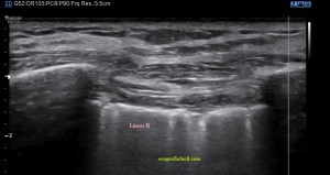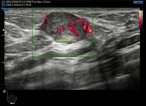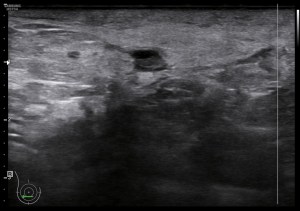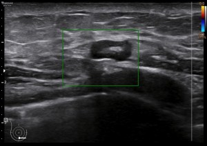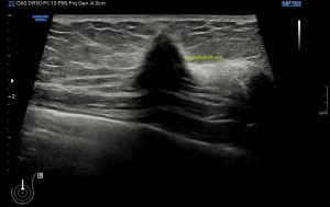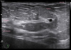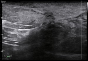 Como puedes ver la imagen mejora mucho la imagen con altas frecuencias, según mi experiencia, y por tanto mejora la capacidad de hacer hallazgos pequeños que pasarían desapercibidos con sondas de baja frecuencia. El equipo debe estar convenientemente ajustado y usaremos los presets indicados para este estudio. En mi caso, el favorito fue el de partes blandas y mama donde conseguí imágenes muy definidas como puedes ver a continuación…Por supuesto influye y mucho la calidad del equipo que estés usando, la imágenes superiores han sido conseguidas con un un equipo portátil, y las que verás a a partir de aquí con un un equipo «fijo» de gama media-alta. También a tener en cuenta las características del paciente a estudio. Diversos factores que te harán decantarte por una u otra opción, pero siempre que se pueda, entiendo que la alta frecuencia, mejora la detección de hallazgos.