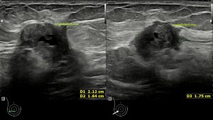 Ecográficamente, encontraremos una zona afectada, de la manera descrita en el párrafo superior, y junto a ella, en una zona normal, sin afectación la semiología normal de la mama.