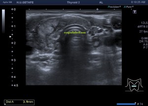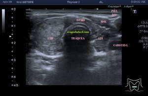 Te enseño las imágenes, típicas de una exploración tiroidea de protocolo con semiología de tiroiditis.