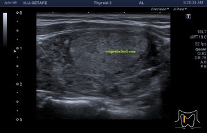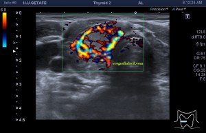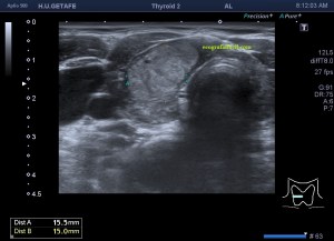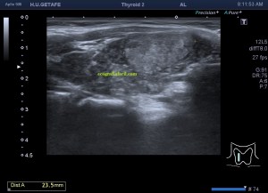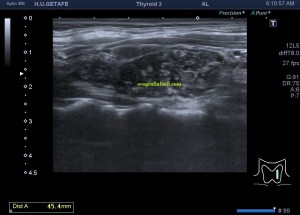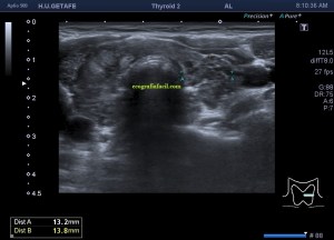 Este es el aspecto ecográfico descrito anteriormente de la patología que habitualmente puede albergar el nódulo del que trata hoy el post y que no es otra que la de la Tiroiditis de Hashimoto.