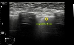 En la imagen 2 puede ver claramente como la anatomía está modificada, el cartílago prácticamente no se visualiza porqué está completamente calcificado. Es una imagen lineal hiperecogénica, prácticamente bajo la piel, con una sombra posterior. El corte transverso, igual aspecto de calcificación: